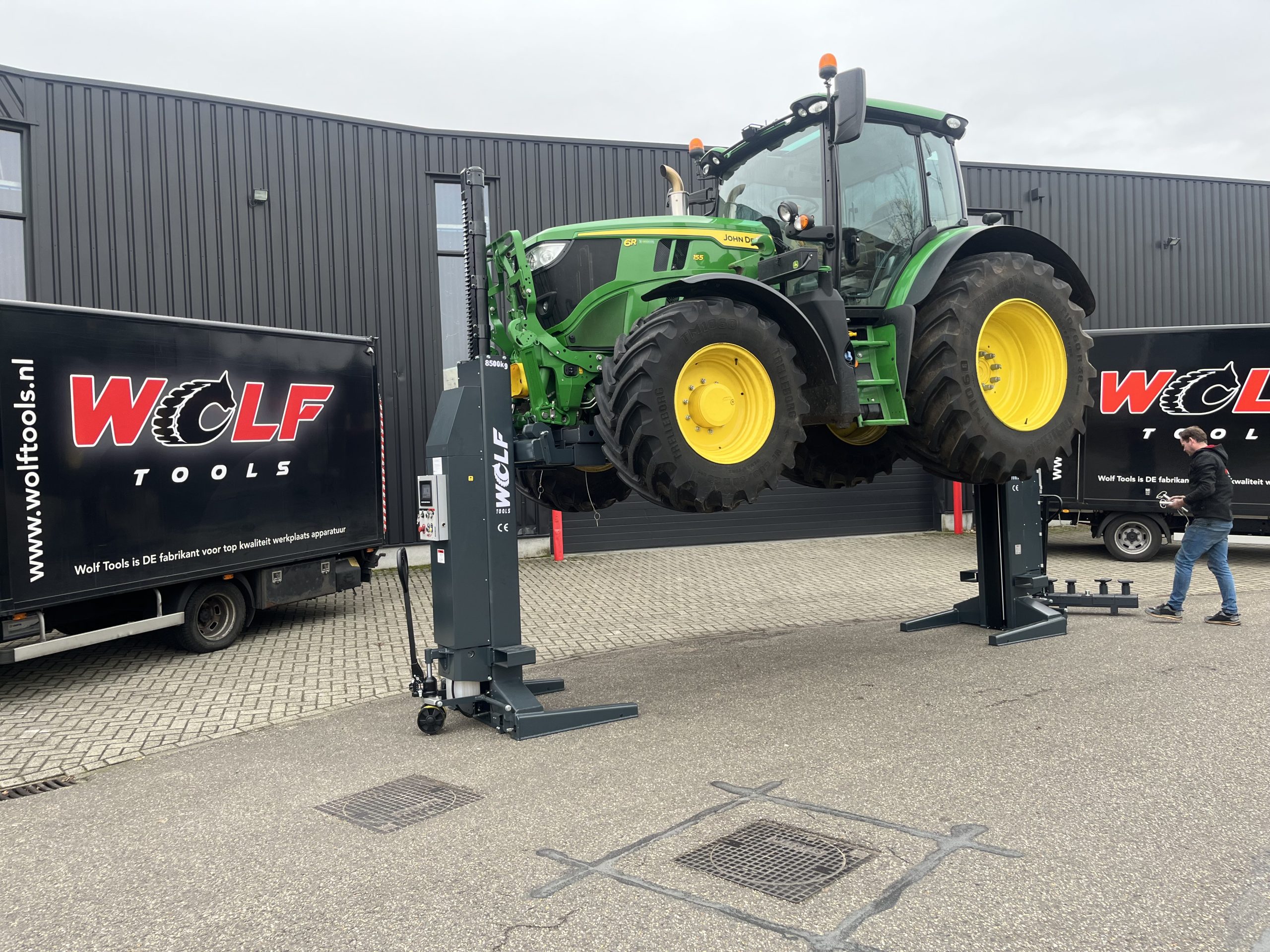 Deze set maakt het mogelijk om eenvoudig een landbouw tractor te liften met behulp van 2 kolommen. Hierbij wordt er 1 kolom aan de voorzijde geplaatst en 1 kolom aan de achterzijde.